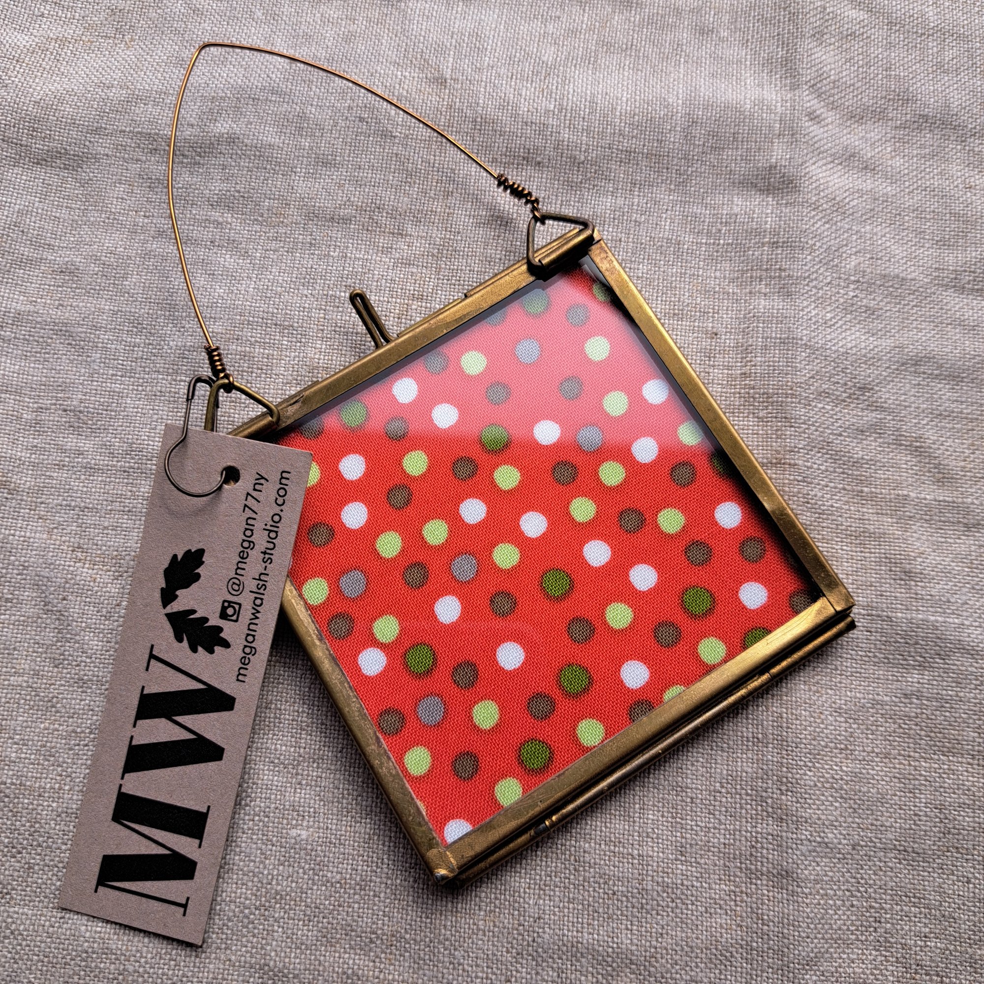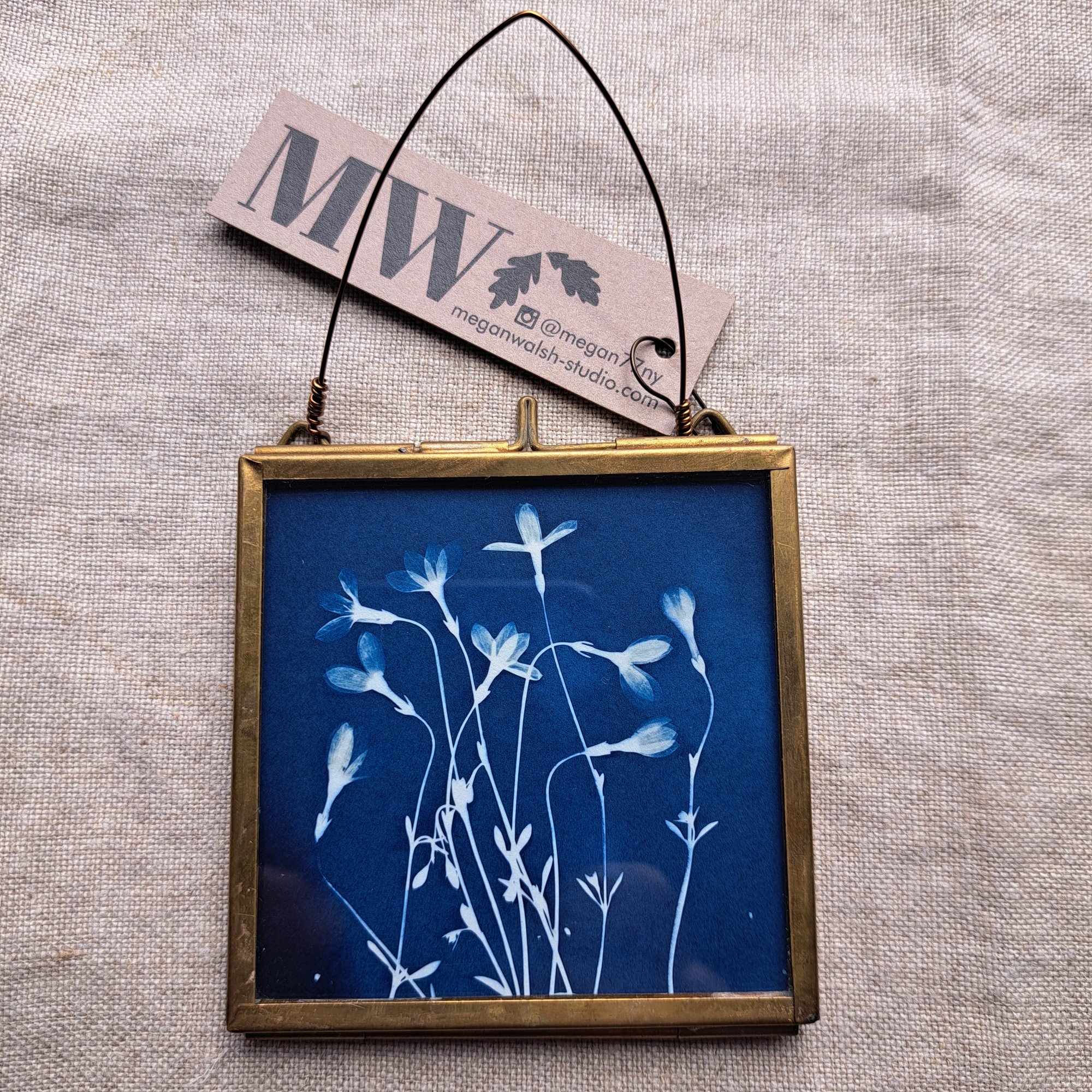 3" x 3" square framed cyanotype with vintage fabric backing.