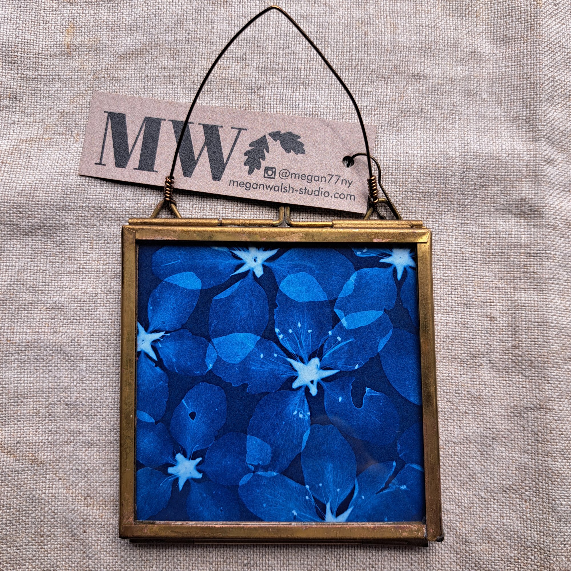 3" x 3" square framed cyanotype with vintage fabric backing.